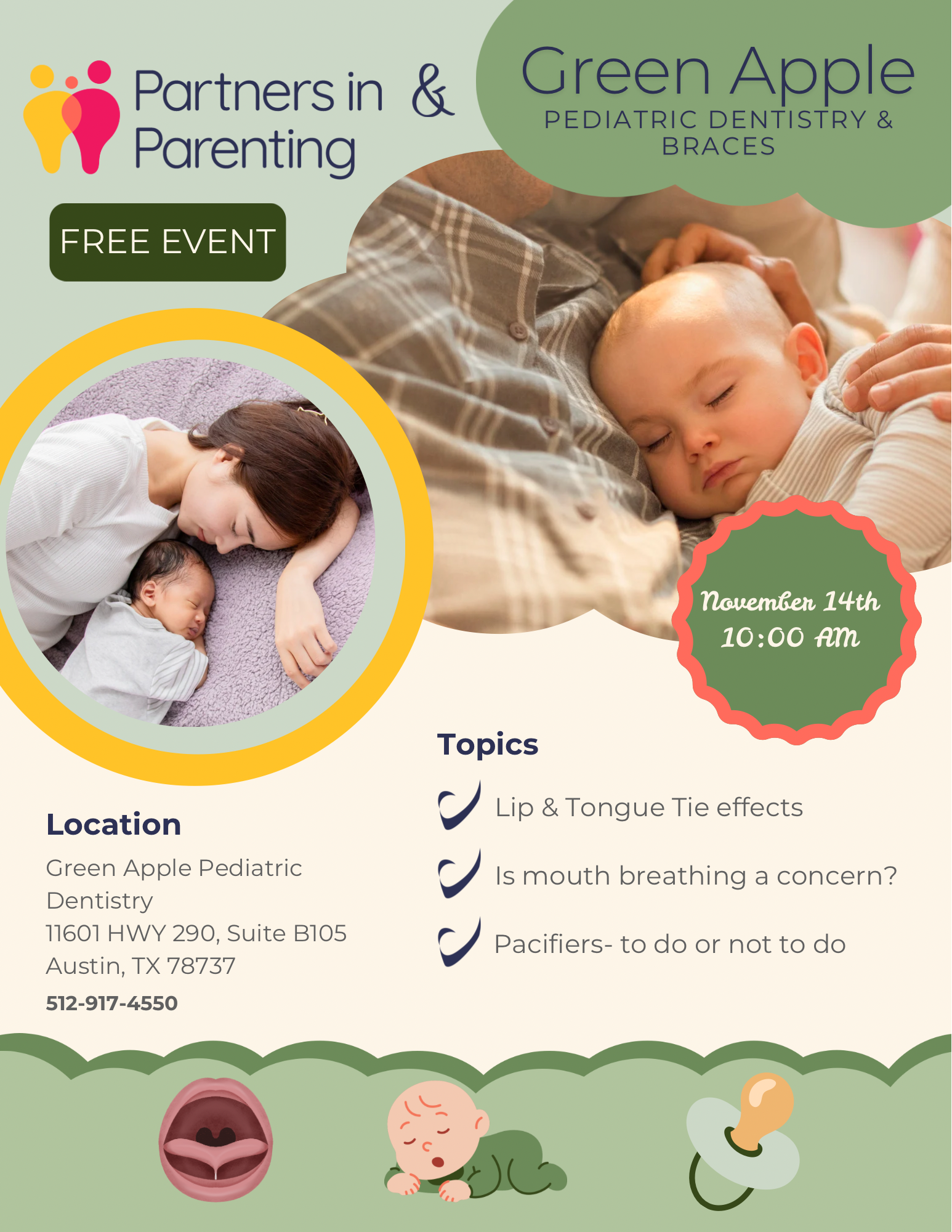 PIP and Green Apple Pediatric Dentistry & Braces are excited to co-host this in-person workshop for expecting and new parents!